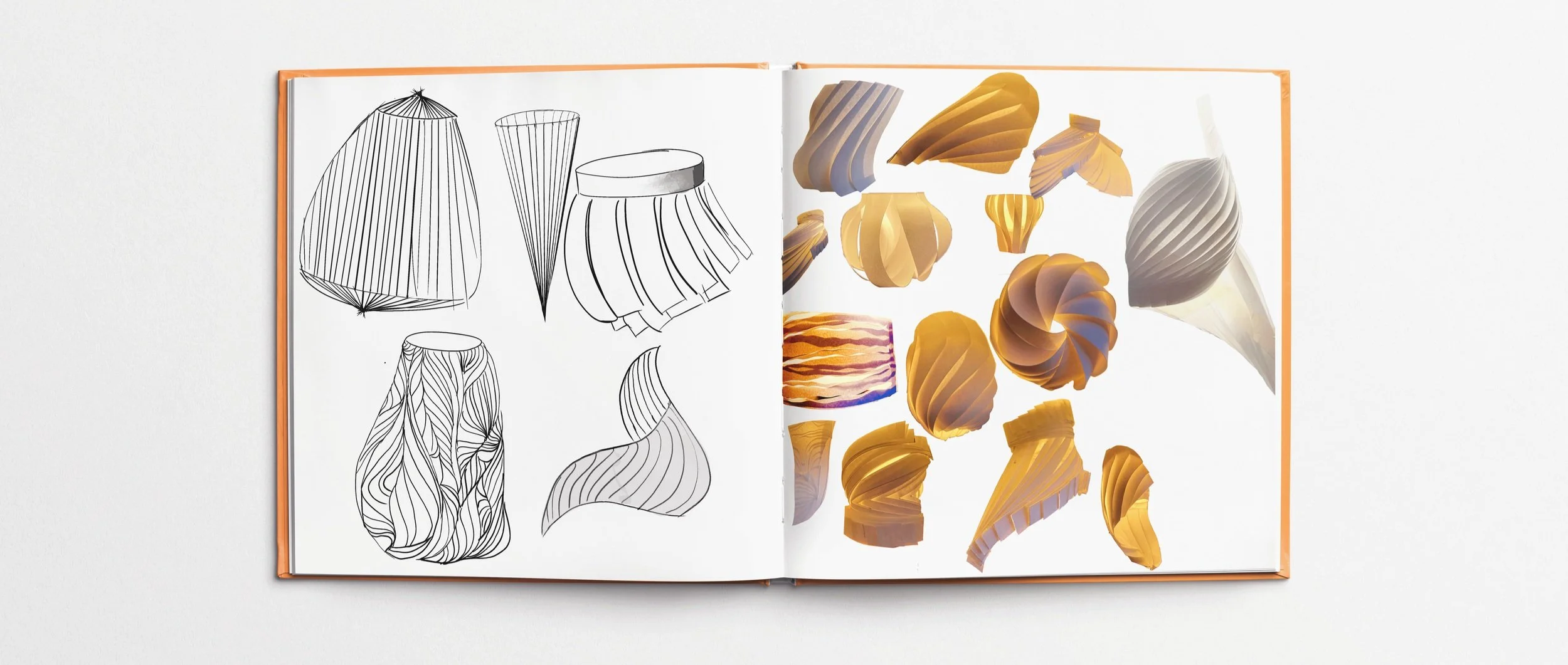 The final design consists of two parts, one of 19 individual rectangles and the second of 14 which cocoons the lightbulb with in the lamp. Each piece is glued together at different points creating the bowing effect as well as an overall flow.